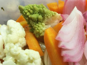 Ingredienti: 3 kg verdura mista (cipolle rosse, sedano, finocchio, cavolfiore, broccolo romanesco, asparagi), 1 cornetto di zenzero, 3 lt di acqua, 3 cucchiai di sale grosso, 6 cucchiai di zucchero, 2 foglie di alloro, 5 grani di pepe nero, 5 grani di pepe rosa, 2-3 bacche di ginepro, 3 bicchieri di aceto bianco, 3 bicchieri di olio di semi, 2 cucchiai di bicarbonato