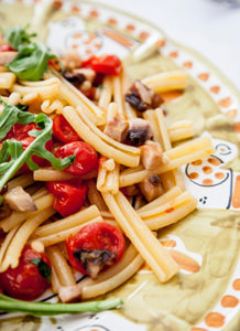 Ingredienti per 4 persone: 350 g di ferrazzuoli (pasta al ferretto) di Gragnano oppure fusilli, 200 g di polpa di pomodorini del “piennolo”, 1 spicchio d’aglio, 500 g di pesce spada affumicato preferibilmente ventresca, 30 g di pinoli, 30 g di uva passa, un mazzetto di rucola, peperoncino, olio extravergine d’oliva meglio se Dop delle Colline Salernitane, sale