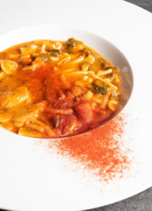 Per la cottura della pasta, ingredienti e procedimento: 280 di pasta di formato misto, crema di pomodori del Vesuvio alle alghe q.b., la buccia di un lime, polvere di peperone affumicato q.b., olio extra vergine q.b, 1 spicchio d’aglio.