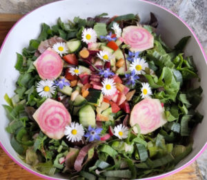 Per il condimento: 2 cucchiai da tavola di olio extravergine, 1 cucchiaio da tavola di aceto balsamico, un cucchiaio di miele, sale, pepe, se si vuole per decorare fiori eduli e fette di barbabietola di Chioggia.
