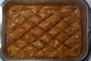 Ingredienti per 4 persone: 25 fogli di pasta fillo (si trova nei supermercati più forniti): in mancanza usare pasta sfoglia, 150 gr. burro, 400 gr. di noci (oppure noci, mandorle, pistacchi), 2 cucchiaini colmi di cannella, ½ cucchiaino di chiodi di garofano in polvere.