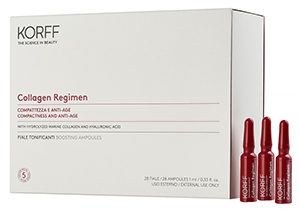 Distende le rughe e restituisce tono e compattezza alla pelle di viso, collo e decollété: Collagen Regimen Fiale Tonificanti Korff (28 fiale x 1 ml, € 79, farmacia). Contiene vitamina C, acido ialuronico e collagene marino idrolizzato. La confezione copre un mese di trattamento.
