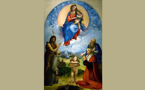 «La figura della Vergine è resa in modo estremamente commovente – spiega Daniela Storti – come una giovane donna che tiene il suo bambino sulle ginocchia, però con un atteggiamento malinconico, che evoca un approccio particolare alla maternità, quasi un presagio del destino di suo figlio. La grandezza di Raffaello sta proprio nel saper concretizzare questi stati d’animo, con tratti pittorici circolari, dalla corona di Angeli Cherubini, alle nuvole che avvolgono il manto della Vergine, al movimento del Bambino che sembra volersi liberare dall’abbraccio della madre, la quale pare invece trattenerlo, quasi a presagire il futuro distacco verso il suo destino, a compimento della missione per cui è nato».