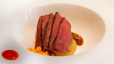 Mettete in ogni piatto un po’ di salsa al caffè, un paio di gocce di salsa di habanero, un po’ di purea di patate e adagiatevi sopra qualche fetta di cuore di vitella. Completate, se è periodo, con qualche fetta di tartufo nero.