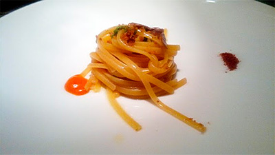 I suoi piatti più che descriverli bisogna assaggiarli. Per capire, gustandola, la sinfonia di sapori frutto di abbinamenti davvero insoliti, a volte azzardati, però sempre azzeccati sulla scia di una cucina fusion ma di buon senso. Come l’ormai famosissimo Cuore di vitella con salsa al caffè, habanero, purea di patate e tartufo estivo; oppure la lingua, ciauscolo e avocado con granita di cipolle rosse; gli gnocchetti di patate con guanciale di baccalà, pomodori confit e salsa alle alici o le tagliatelle al latte di cocco, zenzero, gamberi e ‘nduja calabrese e, ancora, la coda di rospo con zabaione di tamarindo e grano spezzato…