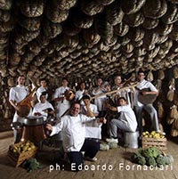 Spigaroli Marilisa Zito 23 Agosto 2016 0:18 Polesine Parmense, 2006 – Massimo Spigaroli con la brigata di cucina del Cavallino Bianco nella cantina dei culatelli dell’Antica Corte Pallavicina. La foto è Novembre nel caslendario di casa Spigaroli 2007