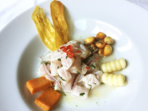 Servire il ceviche in un piatto da portata e decorare con patata dolce e mais Peruviano. Regole di un buon ceviche: