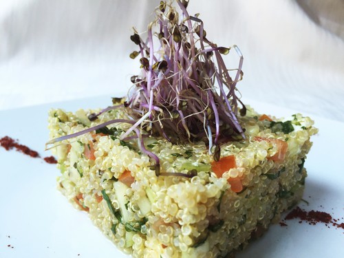 1 tazza di quinoa cotta (deve essere lasciata minimo 1 ora in ammollo per toglierle acidità. Per questa ricetta è possibile cuocerla in acqua bollente con cannella e chiodi di garofano per 15 minuti per poi scolare, asciugare e farla raffreddare il più velocemente possibile)