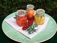 Ingredienti per un vasetto: 70 g di frutta (melone, fragole, mela, pera, ananas), 20 g acqua naturale, 5 g zucchero di canna, 2 g Pectina, 0,5 g aroma naturale di arancio.