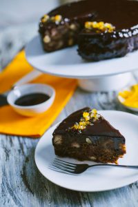 Per prima cosa tagliare a cubetti il pane dopo avergli tolto la crosta e metterlo in una ciotola. Scaldare il latte in un pentolino e, una volta tiepido, versarlo sul pane e lasciarlo ammollare per bene. Intanto, nella tazza di una planetaria, montare le uova con lo zucchero per 10-15 minuti, per ottenere un composto chiaro e spumoso. Incorporare a mano il cacao e la farina Mix Universale Schär setacciati assieme. Mescolare bene. Versare il composto nella ciotola contenente il pane e mescolare delicatamente. Aggiungere ora le nocciole e infine i fiocchi di mais. Ridurre a cubetti le arance candite e aggiungerle al composto. Amalgamare tutto per bene e versare il composto in una tortiera da 24 cm imburrata e rivestita di carta forno. Infornare la torta in forno statico preriscaldato a 180° per 50 minuti. Una volta pronta, lasciarla raffreddare e sformarla su una gratella. Nel frattempo, preparare la ganache al cioccolato. Tritare il cioccolato, quindi scaldare la panna in un pentolino e aggiungere poi cioccolato e burro. Mescolare fino a far sciogliere tutto. A questo punto versare la ganache sulla torta per rivestirla: mettere sotto la gratella un piatto in modo da raccogliere la ganache che cadrà, per riutilizzarla e fare una seconda passata sulla torta. Lasciare rapprendere la ganache un po’ prima di servire la torta e decorare ogni fetta con delle scorzette di arancia candita.