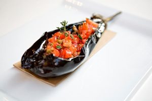 Melanzana fondente con pomodoro condito, nocciole e profumi del Mediterraneo