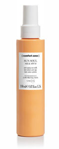 • Un latte spray per capelli che, grazie ai filtri protettivi della formula, aiuta a preservarne colore e idratazione: Sun Soul Milk Spf 10 Comfort Zone (150 ml, 28 euro, Spa e centri benessere). Può essere utilizzato durante l’esposizione al sole su capelli asciutti o bagnati o dopo lo shampoo al posto del conditioner, senza risciacquo.