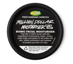 • Million Dollar Moisturizer Spf 30 Lush (45 g, 45,95 euro, negozi monomarca) protegge il viso dai danni dei sole puntando su un mix di attivi selezionati: miele, olio di enotera, karitè, jojoba e lavanda, e filtri solari. Più un pigmento riflettente per illuminare la pelle.