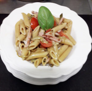 Ingredienti per 4/6 Persone: 500 gr. di pasta penne, 200 gr. Prosciutto di Praga in 2 fette da 100 gr. ciascuna , 5 carciofi con un pochino di gambo, 1/2 kg. di pomodorini ciliegini, 1 scalogno, basilico, burro, olio, scaglie di formaggio pecorino