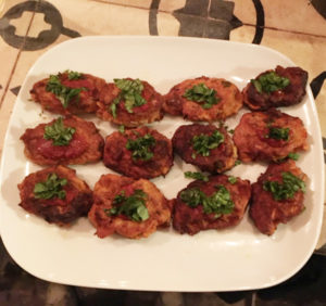 Mettere poi le melanzane in una ciotola, aggiungere le uova, il grana, il basilico tagliuzzato e farne tante polpettine da passare in una pastella omogenea preparata con la farina e un po’ di acqua e da friggere poi in padella con olio caldo. Una volta fritte e sistemate in un vassoio da portata, aggiungere su ogni polpetta, un pochino di salsa di pomodoro e 1 fogliolina di basilico.