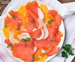• Insalata con salmone, finocchi, arancia, insalatina mista con vinaigrette alla senape