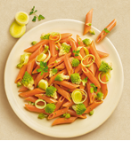Penne alle lenticchie rosse con porri brasati e broccoli romani