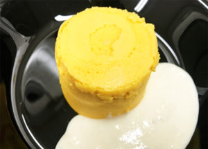 Sfornare lo sformato, toglierlo dagli stampini, metterlo su un piatto e aggiungere la crema.