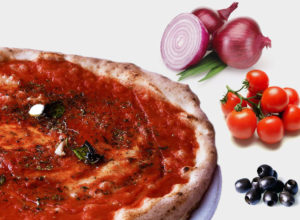 Pizza “prebiotica” con doppia salsa di pomodoro, cipolle di Tropea, olive, aglio e capperi