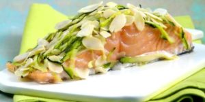 Ingredienti per 4 persone: 600g Salmone Norvegese fresco, 150g Mandorle in fiocchi, 3 zucchine, aneto fresco, olio extra vergine d’oliva, sale e pepe.
