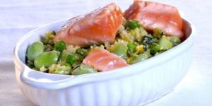 Ingredienti per 4 persone: 600g Salmone Norvegese fresco, 250g cous cous, 250g piselli freschi, 250g fave, 4 zucchine piccole, 1 porro, olio extra vergine, sale e pepe.