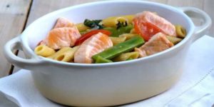 Ingredienti per 4 persone: 600 g Salmone Norvegese fresco, 400g pennette integrali. 200 g taccole,150 g pomodori ciliegini, 1 scalogno, timo, olio extra vergine d’oliva, sale e pepe.