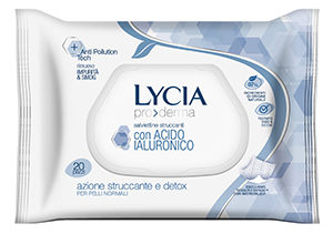 Il plus di Proderma Salviettine Struccanti con Acido Ialuronico Lycia (64 pz, 4,29 euro, grande distribuzione). L’Anti- Pollution Tech, attivo di origine naturale, che rimuove le tracce di smog e inquinamento. L’esclusivo tessuto Bi-Fase™, ha un lato con microrilievi che rilascia il latte detergente e uno liscio per asportare le impurità̀.