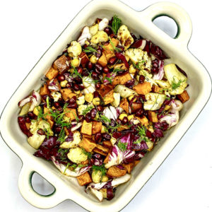 Ingredienti per 1 persona: 200 g di zucca pulita, 200 g di cavolfiori, 60 g di ceci cotti e sgocciolati, un pugno di chicchi di melagrana sgranata, due o tre rametti di rosmarino, 30 g radicchio trevigiano, 1 cucchiaio di succo di limone, 1 ciuffetto di prezzemolo o finocchietto, q.b. olio extravergine di oliva, q.b. sale e pepe.