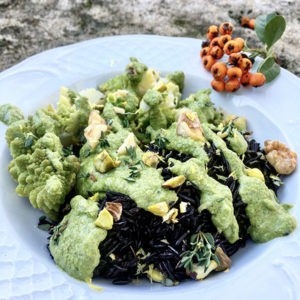 Riso venere con pesto di broccolo romano e noci al timo