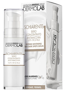 Schiarente Siero Concentrato Anti Macchia Dermolab (30 ml, 18 euro, profumeria) deve le sue performance a un mix di complessi e attivi ad hoc: Gigawhite™, Melaslow™ (estratto vegetale ricavato dal mandarino giapponese), acidi azelaico e cogico ed estratto di papaya, dalle delicate proprietà esfolianti.