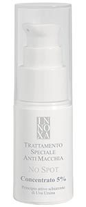 Vanta una concentrazione al 5% il Trattamento Speciale Anti Macchia No Spot Innoxa (15 ml, 48 euro, profumeria). A base di uva ursina, può essere utilizzato singolarmente, prima della crema o associato a quest’ultima o al siero. Aiuta a contrastare l’invecchiamento cutaneo, attenua le discromie e rende la pelle più luminosa, giovane e compatta.
