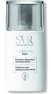 Clairial Day Correcteur Uniformisant Ant-Taches Spf 30 SVR (30 ml, 30 euro, farmacia) offre una tripla protezione da raggi Uva e Uvb, inquinamento e la luce blu. Tra gli ingredienti: il complesso depigmentante Duo White, derivato dell’acido ferulico e un microrganismo marino.