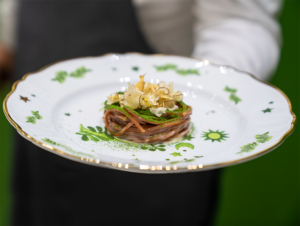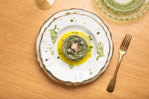 PROCEDIMENTO: Prendere il sedano rapa dopo averlo sbucciato, tagliarlo in piccoli pezzi, aggiungere la patata, la cipolla, coprire con il latte , la foglia di alloro e cuocere per circa 1 ora a fuoco lento. Con l’aiuto di un frullatore ottenere una crema liscia e omogenea. Prendere il prezzemolo, privarlo dei rametti, lasciar disidratare le foglie in un forno a 55 gradi per una notte, poi frullare con il frullatore e ottenere una polvere fine. Prendere il topinambur, lavarlo e asciugarlo e, con l’aiuto di una mandolina, tagliare delle fette sottili e lasciarle sotto acqua corrente fredda per circa due ore per eliminare l’amido.