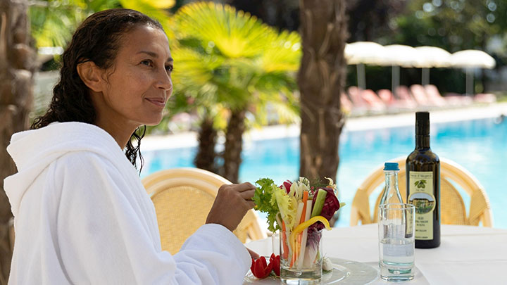 «La filosofia che sta alla base della buona salute è l’omeostasi, ovvero l’equilibrio dinamico che permette all’organismo di stare in buona salute e non ammalarsi», puntualizza il professor Fulvio Ursini, coordinatore del programma dedicato all’alimentazione delle settimane Fit. «Per fare un esempio, è come dover controllare una barca a remi che va controcorrente e riuscire a mantenerla ferma. Per questo è importante allenare l’organismo allo stress: non solo a quello fisico, ma anche a quello dietetico, mettendo in atto una serie di “restrizioni caloriche” che inducono a sviluppare meccanismi di “sopravvivenza” e quindi a consumare le calorie in eccesso. Non bisogna mai mangiare troppo di quello che fa bene, ma nemmeno troppo poco di quello che potrebbe far male. La misura giusta sta nell’equilibrare queste due tipologie di alimenti. In particolare è opportuno consumare verdure, soprattutto crucifere (broccoli, rucola, cavolfiori, cavoli) e frutta, come le mele ricche di polifenoli: contengono antiossidanti che aumentano la capacità dell’organismo di reagire agli stress e abbassare l’indice infiammatorio, che sta alla base di molte malattie. I cibi poi vanno assunti in quantità moderate, diminuendo gradualmente le porzioni durante la settimana e aumentando invece la frequenza, con piccoli snack a metà mattina e pomeriggio, per ridurre l’appetito. Per ridurre lo stato infiammatorio è importante il contributo dell’acqua termale che spegne la microinfiammazione a livello cellulare e rallenta anche quella cronica causata dall’invecchiamento. In questo modo si pongono le basi per invecchiare bene e in salute».