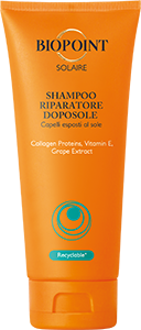 Deterge, idrata, ristruttura e protegge i capelli, riparando le parti danneggiate dal sole, dall’acqua di mare e dal vento: Shampoo Riparatore Doposole Biopoint Solaire (200 ml, € 4,50, profumeria). Il flacone è in plastica 100% riciclata e riciclabile.