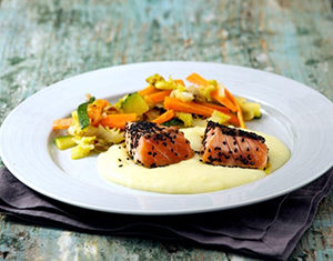 Ingredienti per 4 persone: 600 g Salmone Norvegese fresco, 4 patate, 2 carote, 2 zucchine, un porro, una verza, un bicchiere di latte, una cipolla bionda, olio extra vergine d’oliva sale e pepe, sesamo nero.