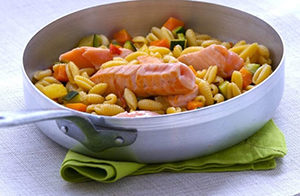 Ingredienti per 4 persone: 600 g Salmone Norvegese fresco, 350 g gnocchetti sardi, 2 zucchine, una patata, 2 carote, una cipolla bionda, scorza di limone, olio extra vergine d’oliva, 20 pomodori ciliegini.