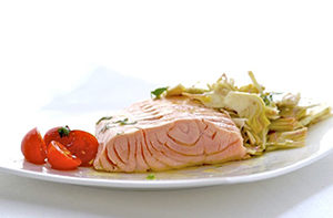 Ingredienti per 4 persone: 700 g Salmone Norvegese fresco, 6 carciofi, un limone, prezzemolo, rosmarino, salvia, olio extra vergine d’oliva, pomodori ciliegini.