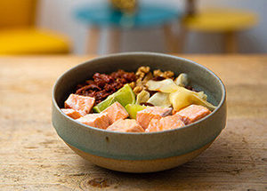 Preparazione: cuocere il riso rosso e lasciarlo raffreddare. Tagliare il salmone a cubetti e metterlo a cuocere a vapore. Una volta pronto condire con salmone, noci sgusciate, uvetta, pomodori secchi, zenzero, lime tagliato e un filo d’olio.