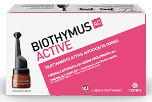 Il Trattamento Attivo Anticaduta Donna Biothymus AC Active (3,5 ml x 10 fiale, € 66,10, farmacia) unisce ingredienti specifici per il ciclo vitale del capello (aminoacidi, taurina, vitamine del gruppo B e oligoelementi) a mediatori di assorbimento che ne prolungano l’attività. Grazie a questo sistema l’effetto anticaduta è prolungato nel tempo e consente l’applicazione di una fiala ogni 3 giorni.