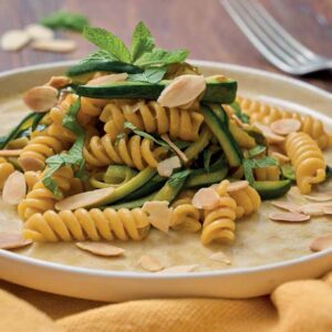 ♦ Fusilli con zucchine, menta, porro e mandorle tostate