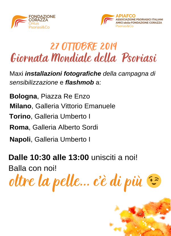 In occasione della Giornata Mondiale della Psoriasi, dal 26 al 31 ottobre, sarà possibile visitare la mostra di sensibilizzazione sulla psoriasi: “La bellezza nell’imperfezione”, una rassegna fotografica aperta al pubblico, allestita negli spazi di Confcommercio ASCOM a Bologna. Sono coinvolti 12 fotografi di fama internazionale che racconteranno la psoriasi attraverso la pelle e le immagini di Carlotta, testimonial di questo evento. Domenica 27 ottobre, dalle 10.00 alle 18.00, gli scatti d’autore si trasformeranno in maxi installazioni fotografiche di 4 metri, in cinque città italiane: Torino, Milano, Bologna, Roma e Napoli. In ogni città, dalle ore 11.00 alle ore 13.00, verrà distribuito del materiale informativo e giovani medici saranno a disposizione per rispondere a domande o dubbi sulla patologia. Ad animare l’intera mattinata ci sarà un flashmob con 25 ballerini che danzeranno sulle note di un brano musicale. Per i più veloci che si uniranno alla coreografia ci sarà la t-shirt celebrativa in regalo! Di seguito le locandine della mostra e della giornata del 27 ottobre.