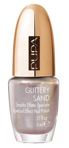 Un colore luminoso e materico per creare sulle unghie tocchi di luce: Glittery Sand Smalto Effetto Speciale 001 Pupa (7,20 euro, profumeria e grandi magazzini). La formula, arricchita con finissime perle e glitter per una cangiante luminosità, non contiene toluene, formaldeide, dibutyl phthalate, né canfora.