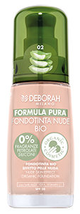 Formula Pura Fondotinta Nude Bio Deborah Milano (30 ml, € 23, profumeria e grandi magazzini) assicura una copertura media con un finish naturale. La nuova formula biologica certificata dall’ente CCPB (Consorzio Controllo Prodotti Biologici) è composta da ingredienti 100% naturali, dei quali il 41% biologici. Oltre a essere biologica, è certificata vegana.