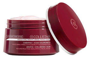 Una crema-gel da utilizzare come maschera dopo il lavaggio, lasciandola in posa 5-10 minuti o come impacco su capelli asciutti per 15 minuti: Attivi Puri Maschera+Impacco Ricostruttivo Riempitivo Collistar (200 ml, 22 euro, profumeria). Oltre a cheratina e acido jaluronico, contiene pantenolo, vitamina E e un derivato dall’olio di ricino, che ripara le doppie punte.