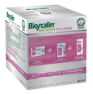 Bioscalin Sistema TricoAge Giuliani (30 compresse, 40 + 200 ml, 69 euro, farmacia) è un trattamento per proteggere e prendersi cura dei capelli indeboliti in modo completo ed efficace. Comprende un integratore per agire dall’interno apportando nutrienti specifici, un siero anticaduta e antietà e uno shampoo rinforzante.