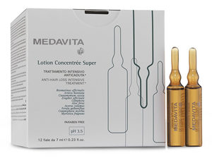 Con un pool di estratti naturali (aloe, zenzero, calamo, canfora, arnica, galbano, rosmarino, cannella, mirra, noce moscata), Lotion Concentrée Super Trattamento Intensivo Anticaduta Medavita (12 fiale da 7 ml, 63 euro, parrucchiere) stimola il microcircolo e inibisce gli enzimi responsabili delle modificazioni funzionali alla base della caduta. Le sue proprietà vasoattive, antiossidanti e ossigenanti stimolano la ricrescita e allungano il ciclo vitale dei capelli.