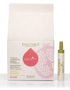 La formula di Biomed Hairtherapy Density Trattamento Anticaduta Stagionale Soco (12 fiale x 6, 40 euro, parrucchiere) è arricchita con acqua costituzionale biologica di melograno, ricca di alleati per rinforzare i capelli come manganese, fosforo, potassio e vitamine. Più estratti bio di mirtillo nero e limone, per riattivare la microcircolazione, e di peonia suffruticosa, antiossidante e lenitiva sul cuoio capelluto.