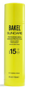 La Protezione Media Viso & Corpo Spf 15 Bakel Suncare (150 ml, 72 euro, profumeria) contiene un mix di sostanze in grado di garantire un’azione anti-età globale: silanolo che contrasta la perdita di elasticità e tono, hamamelis e camomilla per un’azione lenitiva e anti-arrossamento, olio di baobab, nutriente e antiossidante.