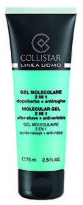 Gel Molecolare 2 in 1 Dopobarba + Antirughe Collistar Linea Uomo (75 ml, 29 euro, profumeria) abbina l’azione lenitiva e disarrossante dell’aloe e degli estratti di camomilla e liquirizia a quella antirughe dello SpeciMen™, complesso elasticizzante e ricompattante studiato per la pelle maschile.